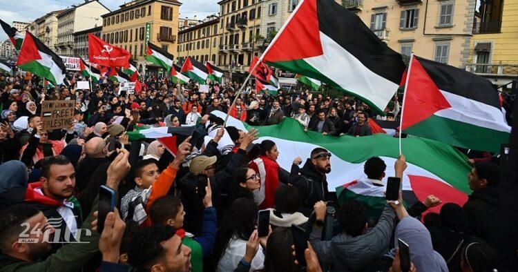 ورفع المشاركون أعلام فلسطين ولافتات كُتب عليها شعارات مثل “الصهيونية خطر على العالم” و”يجب طرد السفير الإسرائيلي من إيطاليا”، ورددوا هتافات تضامنية بينها “الحرية لفلسطين”، و”جميعنا مناهضون للصهيونية”، و”من النهر إلى البحر.. فلسطين حرة”، و”إسرائيل دولة صهيونية إرهابية”.