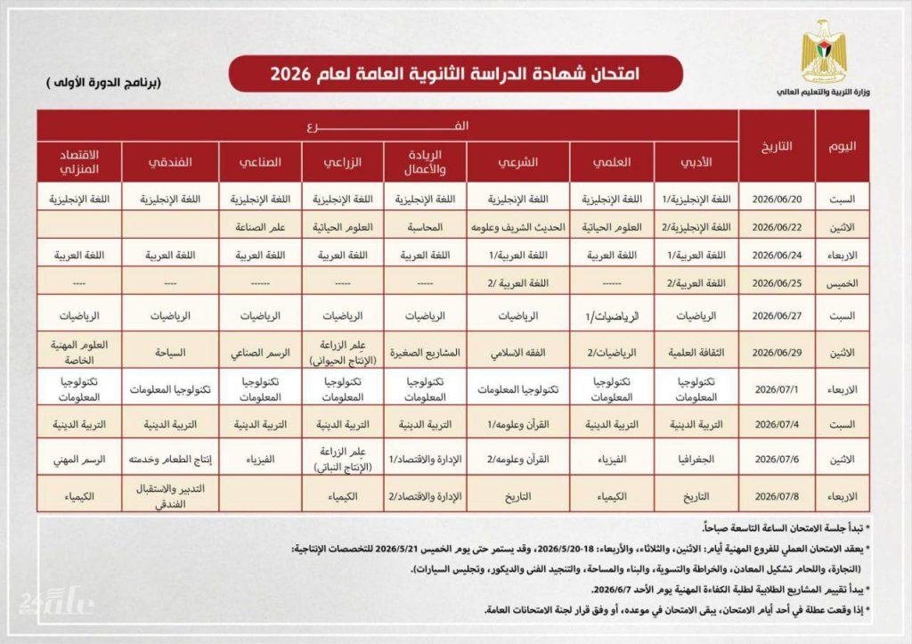 أعلنت وزارة التربية والتعليم العالي الفلسطينية ، الاربعاء 25 فبراير 2026 ، موعد عقد امتحان شهادة الدراسة الثانوية العامة للعام 2026، في دورتيه الأولى والثانية.